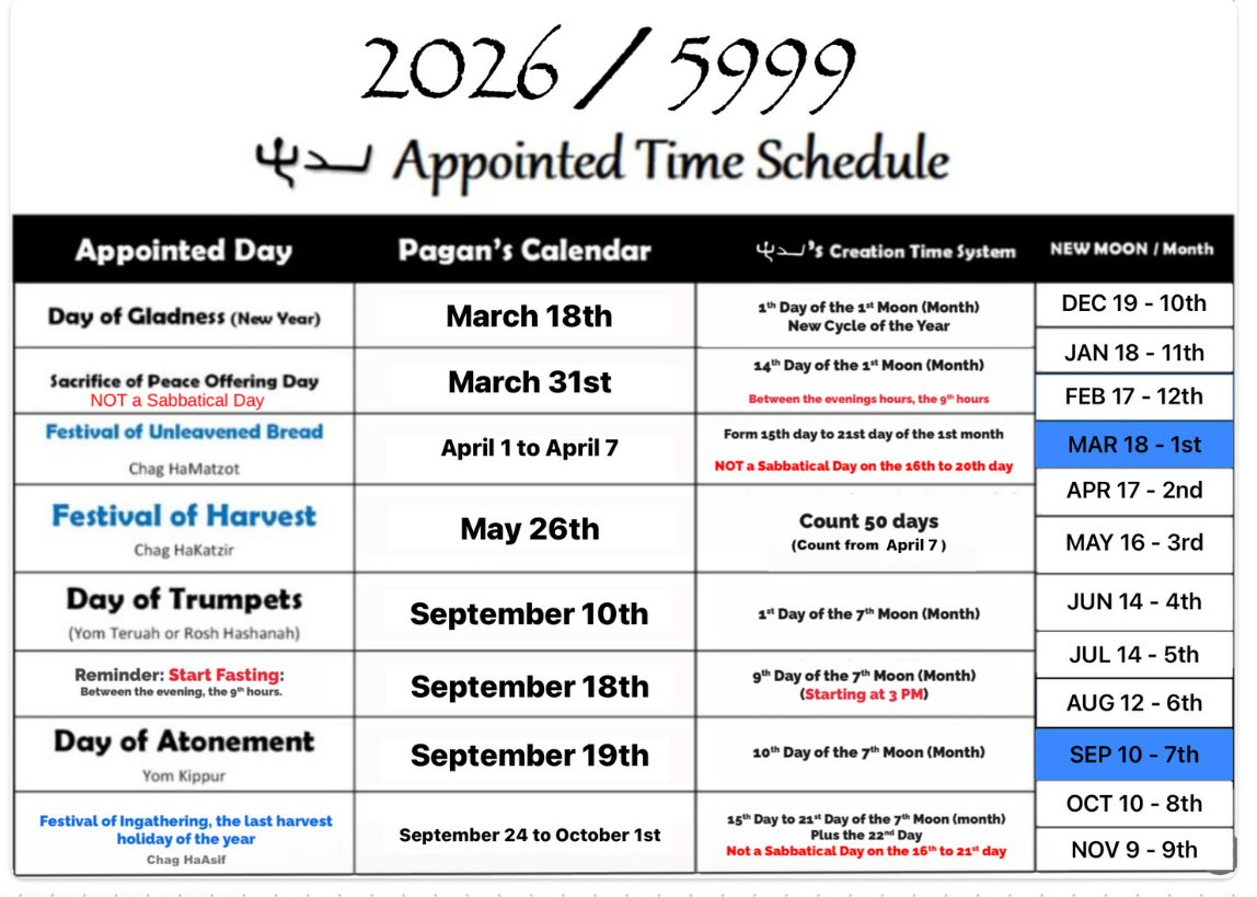 This odd calendar above is a set of like 30 days by 12 months cycle year. This equals 360 days a year. Yet, we should not rely on the exact 360 (or any pagan number such as 365, 355, or 383) days a year anyway. Stick with a simple appointed time (Creation time) system that was instructed by π€π€. Understand why π€π€'s calendar system is followed by the sign of time such as the sun, moon, and stars. The daytime and night cycle by the sun, the season-by-season cycle by the moon, and the yearly cycle are known by the starsβ movement. Knowing that 12 New Moon (Months) cycle equals one year.